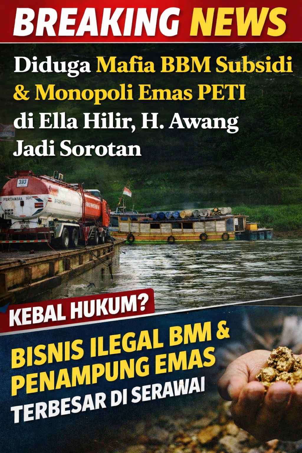 Warga juga menyebut, sosok H. Awang yang akrab disapa “Dok” ini berdomisili di wilayah Ella Hilir, tepatnya di Natai Suri. Ia diduga telah lama menjalankan bisnis distribusi BBM ilegal yang menyasar lokasi-lokasi PETI di daerah hulu.